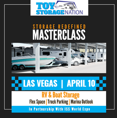 Attention business developers and investors hunting the next big thing: Toy Storage Nation’s “Storage Redefined Masterclass” gives entrepreneurs expert advice to accelerate success in the self-storage industry’s fastest growing subsectors, April 10, at the ISS World Expo in Las Vegas. This one-day educational event unleashes best practices for getting RV and boat storage facilities up and running as quickly and profitably as possible, along with expert advice for profiting in complementary high-growth storage assets.